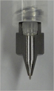 有關粘合(粘貼)材料內(nèi)發(fā)生的混合比例的瞬間變化,TECDIA通過對調(diào)劑時壓力變化的判斷,認為必須解決調(diào)劑時的壓力才是重點,然后嘗試開發(fā)出使壓力難以產(chǎn)生的,"可提高材料流動性"的點膠針頭。