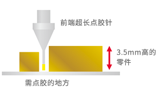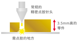 作為解決方案,點膠針的最前端必須要高于旁邊的零件,至少達到4.5mm以上。因為組建方式和標準頂針,內部存在段差,會發生材料堵塞和硬化。所以在維持能夠對細小的地方進行穩定的精密點膠這一性能的基礎上,非常需要前端加長的新型點膠針。