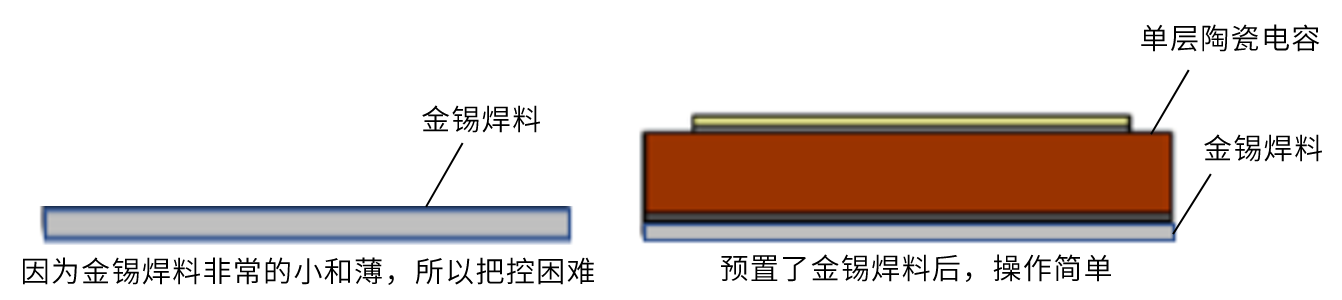 一直以來金錫焊料的使用是放置于電容和基板之間,那么作為環氧樹脂的替代品就需要把金錫焊料設置成片狀。但是,片狀的金錫焊料特別的薄和小,在拼貼操作上不僅把控困難,也會發生因設置的位置偏移而短路。