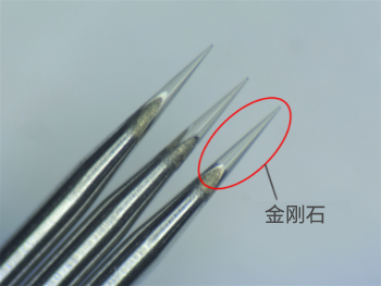 由TECDIA提出將針頭的前端使用金剛石材料的「金剛石頂針」。在給顧客使用的評價中,使用傳統材料的頂針,大約在使用5000次左右時必須對頂針進行更換,但是使用鉆石材料制成的頂針,在工作了60萬次之后其前端的形狀依舊保持完好,于使用前的狀態相比幾乎沒有差別。