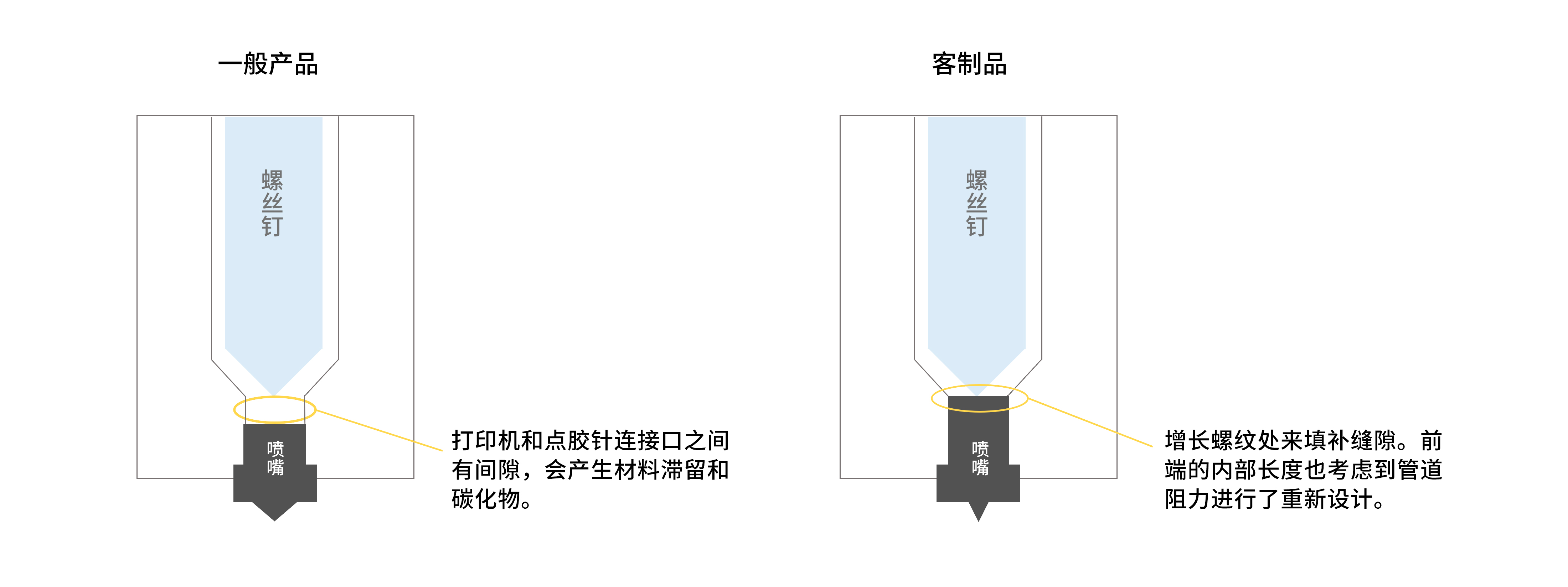 噴嘴內(nèi)部的長(zhǎng)度在設(shè)計(jì)時(shí)考慮到了管道阻力,因此,在提高材料流動(dòng)性的同時(shí),還能有效地回縮。此外,客制的點(diǎn)膠針形狀也可填充打印機(jī)和點(diǎn)膠針連接口之間的間隙,從而減少材料滯留和碳化物的產(chǎn)生。