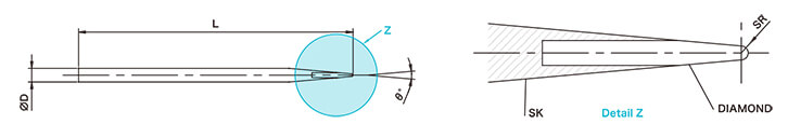| 型號 | 直徑(φ) | 前端角度(°) | 長度(L) | 前端R(μR) |