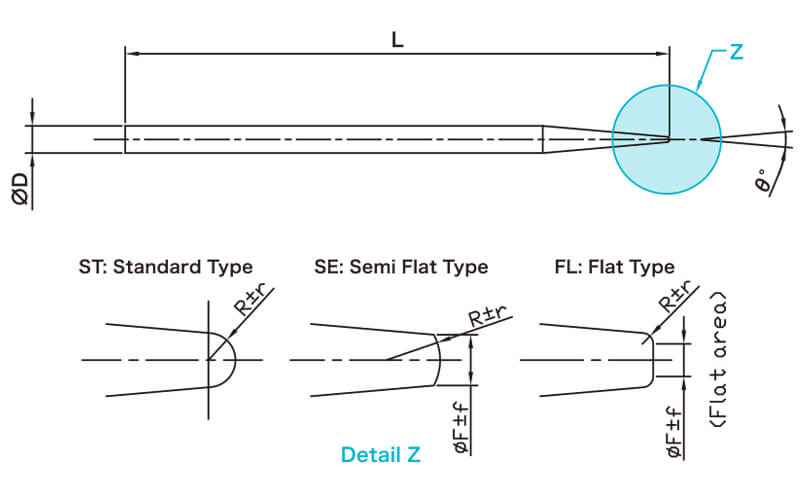 可指定材質、直徑(φD)、角度(θ)、長度(L)、前端R及形狀(Detail Z)進行定制。